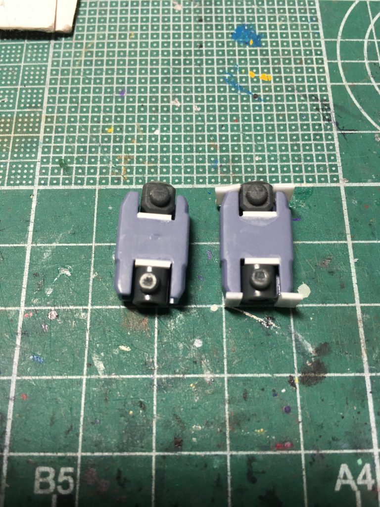 以前膝にスペーサーを噛ませた都合上、ポリキャップが見えすぎたりもも裏に隙間ができるので、プラ板を貼り足して延長。ジャンクのポリキャップからキットと同型のものを組み込んで接着ガイドにしました。はみ出して抜き差しできなくなる恐れもないので。