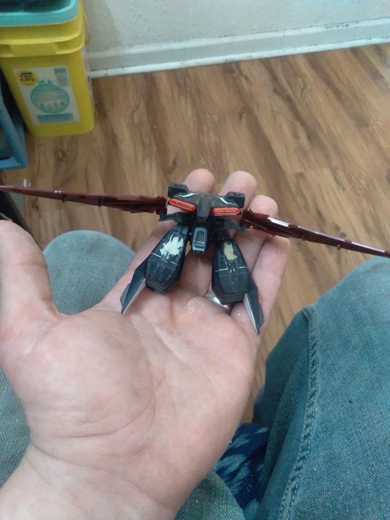 This started out as the backpack to the perfect strike freedom. I removed the dragoons and the big wings and made some wings from the ninpulse weapon. I plan to add some thrusters under the wing and maybe weapon storage. There will also be 2 beam saber handles in it like the aile pack