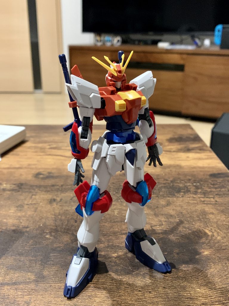 ブレイジングガンダムは全体的に男性的なシルエットなので、女性的なイメージに変えられないから模索中。手足は直線が多いのでカミキバーニングの手足で曲線的に、腰をジャンクパーツで延長して腰部に細身を出してみました。