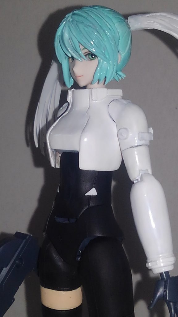 髪の毛はガイアのミクカラーで塗ったんですが、この塗料はクレオスのシンナーやリターダーと合わないですね。なんか混ざらないんですよね。そして結果筆塗りしづらいです。あたかもマスクゾルを塗ってるかのような塗りづらさでした。ガイアの塗料は使ったことが無いのですが、何か間違ったかな。やっぱガイアのシンナー使わんとダメですかね。色味はいい感じなんですけど。