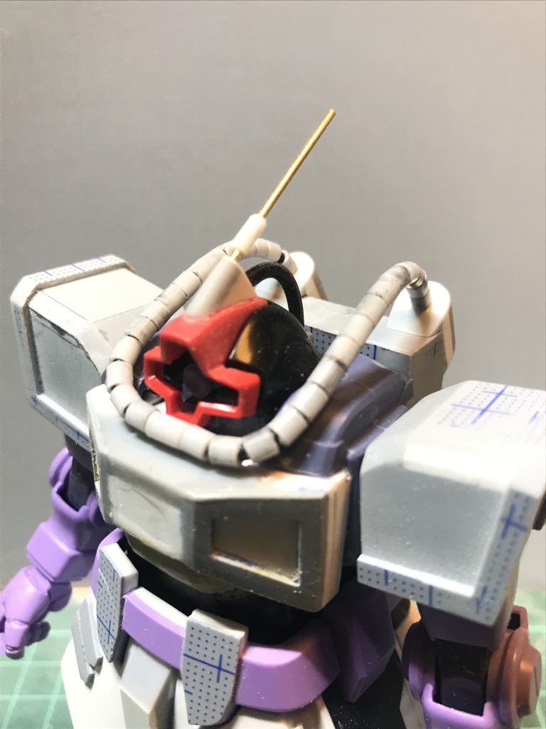 脚部を整形しつつ、乾燥を待っている間に頭部をトロピカルドムに変えるべく、プラパイプと真鍮線でアンテナを作り、特徴的な口元を、3ミリプラパイプを3ミリずつカットして動力パイプを製作しました〜*\(^o^)/*
