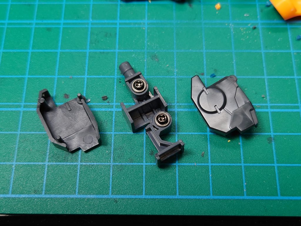 久々の古いMGで、関節にはビスを使用してますが……ヒザの剛性がてか軟性? 特に横に柔らかい(-_-;) 関節自体はイイ渋さなのですが、本来は曲がらない方向にぐにゃぐにゃ動きますね。ショックアブゾーバーなのかな?って思えるほどです。しかもABS(;´∀`) 怖い怖い… 関節の流用は厳しいから、とりあえずはこのまま進めますかね〜
