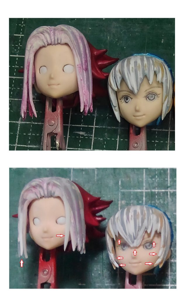 前髪とか細かい毛先は必ず細く切ったプラバンです。接着強度が不安だったら受け側にピンバイスで穴をあけて差し込んで止める。受け側に溝を作って止めるなどすればがガッチリつきます。