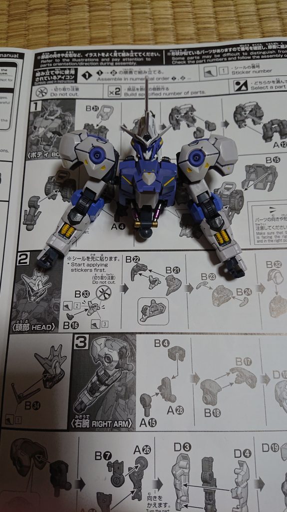 腕の外装は黒部分を以前調色したハガネマルフィスト、青は調色したイセイブルーにミスターカラーのキャラクターホワイトを少々混ぜました。