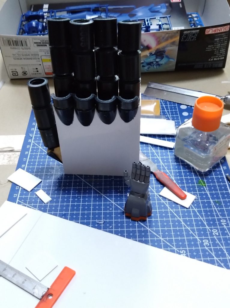 とりあえず大型化しか頭になかったもので水道管で指部分の制作、指の芯(本来関節の部分)には家にあった配線保護用のコルゲートチューブを使いました。(可動はしませんが)