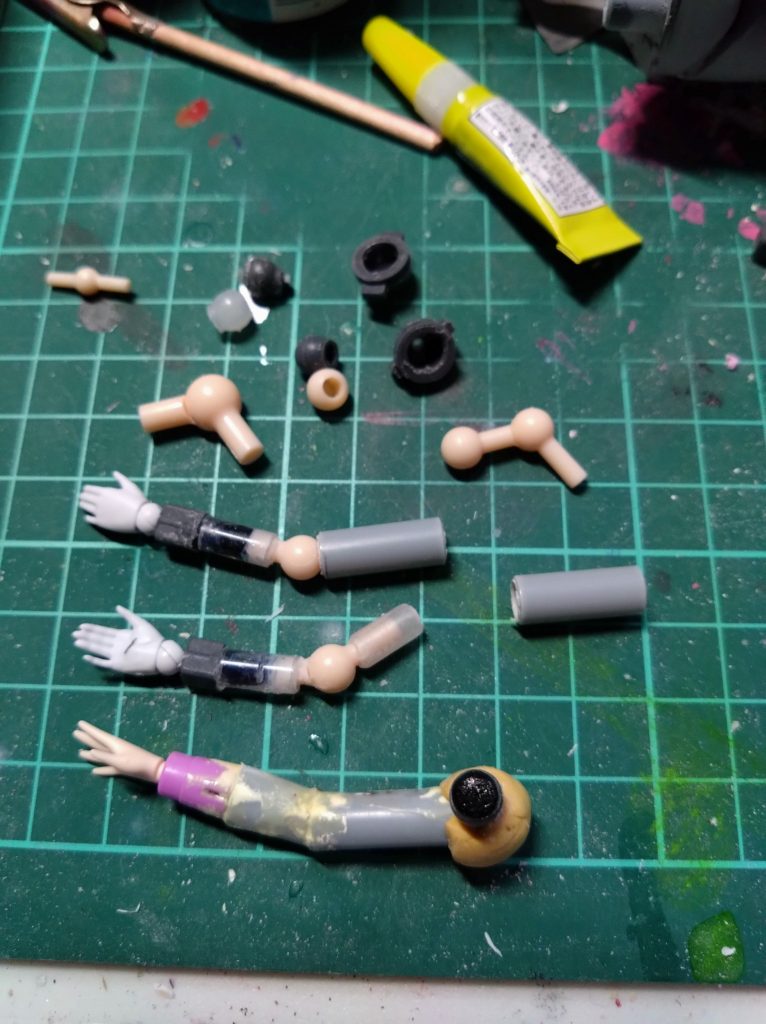 腕は前に固定で制作したものを参考に寸法合わせてます。ジョイントパーツを5mm透明パイプと瞬間接着剤で繋ぎ、透明パイプの上から7mm?グレーのパイプ被せるようにしました。まだ構想中なので肘より上は固定してません。