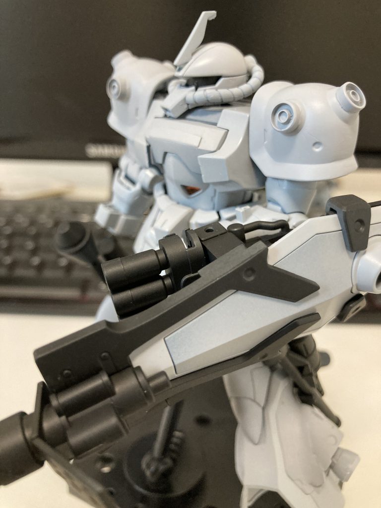 ということでグフカスタムを高機動型にカスタム中です。ようやくサフを吹いた所まできたので仮組みしました。