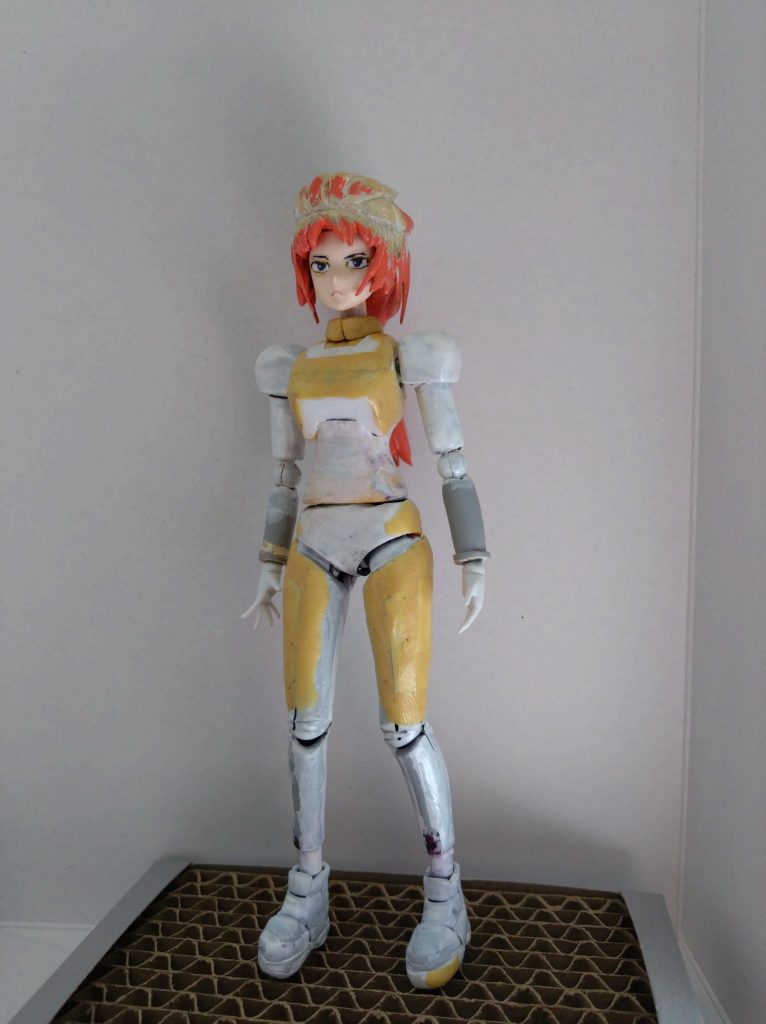 上半身のアーマー部分は頑張った鎖骨を埋めるようにアーマーの下地を作りました。その上に下地の上にアーマーの肩のラインを出したくてプラ板を貼り付け、胸の下部分と背中にもプラ板を接着しました。そのプラ板ともともとのボディに擦付けるようにパテ盛りしました。