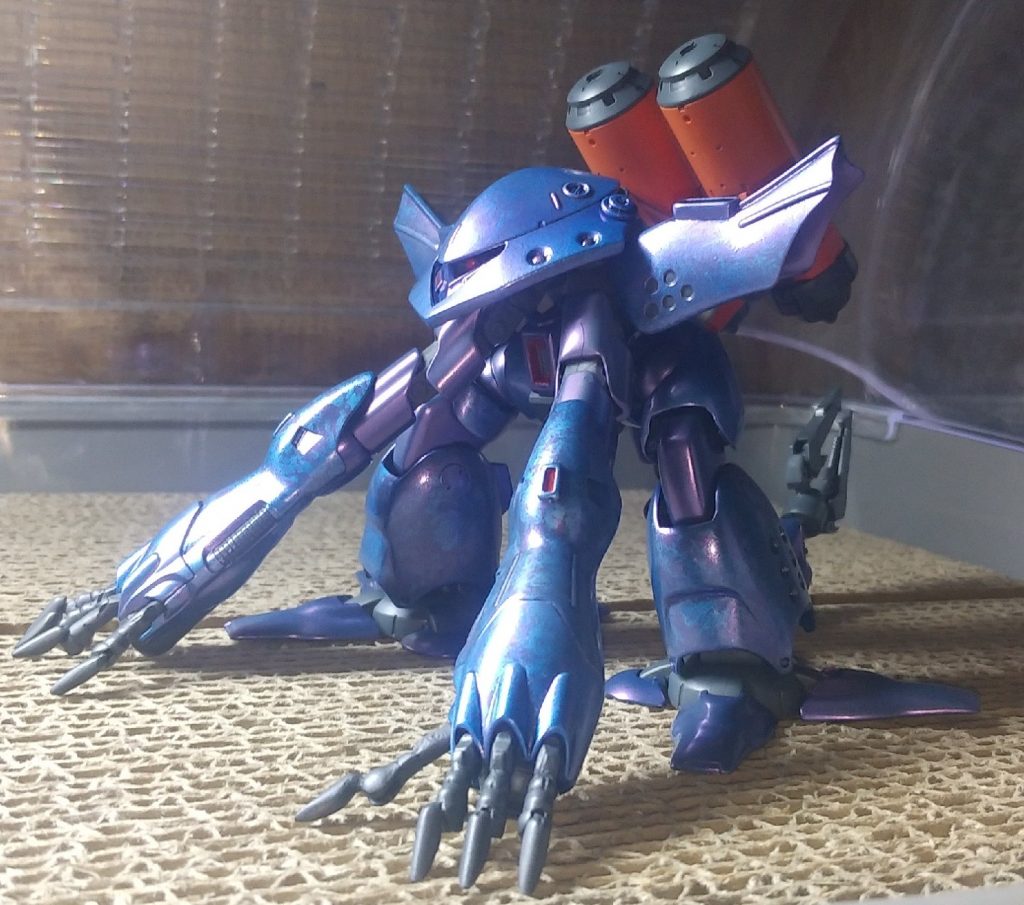 ちびハイゴッ君ほぼ完成っす( ´∀`) 肩アーマー他を小型化 水中形態への簡易変形 モノアイ可動化 バイスクロー(爪先)関節の可動化 このバイスクローを8本作るのが一番怠かった(*´д`*) でもちびハイゴッ君には、純正の爪のままだと細長過ぎるのですよ 悪魔っぽい?蜘蛛っぽい爪の造形を目指しましたが どうでしょう? 苦労した甲斐があって大地を掴んでる感が増して良い感じな気がする(自画自賛)完全に爪先が折り畳めるので、ビームサーベルとかの棒状武器ならなんとか持てます シャイナさんのサンダークローも再現可能w ライフル系はさすがに持つのは無理やが(´・ω・`) 塗装の方は外装部分だけラップ塗装風処理をしてクリアブルーを吹き付けました その上に紫パールを吹き付け この段階で、テロッテロの紫になってしまいましたが スーパークリアでコーティングしたら、かなり落ち着きました