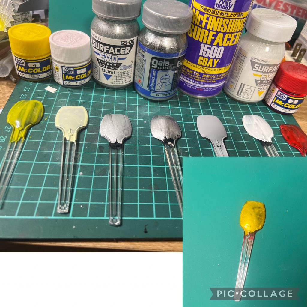 まずはメイン写真の様に下地を塗ってみました。上に置いてあるのがその塗料ですゴールドだけ別になっているのでゴールドはガイアのブライトゴールドです。