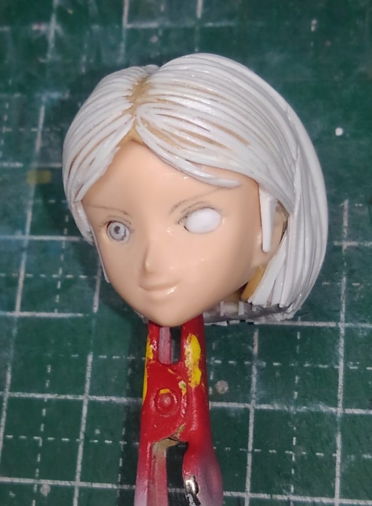 作成中のエマさんです。最近プラバンの髪の毛を皆さんがやたら褒めて下さるのでいつもより2割り増しぐらい気合を入れてプラバン貼りましたw 悪くないですが似てるかというとちょっと分からないですね。もっとボリュームが必要だったかな?と思わなくも無いです。塗ってみて違和感あったらまた再調整ですかね。なので再調整時に面倒なのでサフは使わずになるべく丁寧にヤスって仕上げました。左目は手術中です。