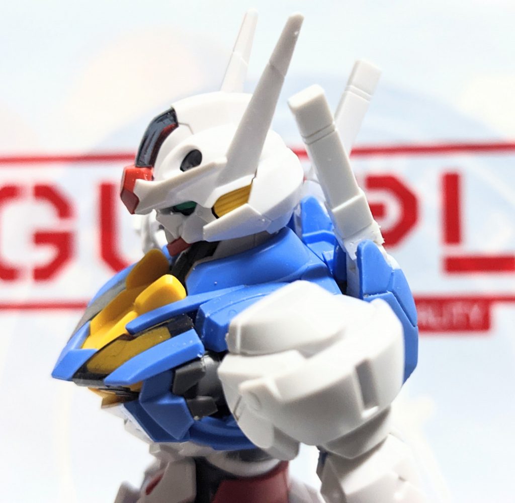 エクシア腰のパーツを連結部分だけ残してカット。エアリアルのバックパックは本来のラック部分がついた黒いパーツを青いパーツと接続するための丸軸部分まで大胆カット。ここまで削らないと接着面が確保できませんでした。あとはプラ板で高さを調整しつつ接着。