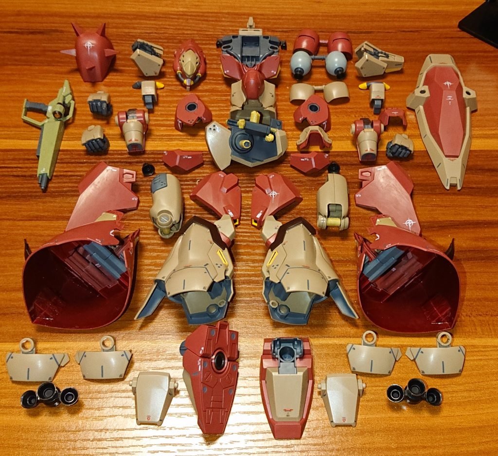 部分塗装は設定画に従い、パイプ基部をイエロー、バックパックスラスターの球体部分をライトグレー、武器をグリーンで塗装しています。