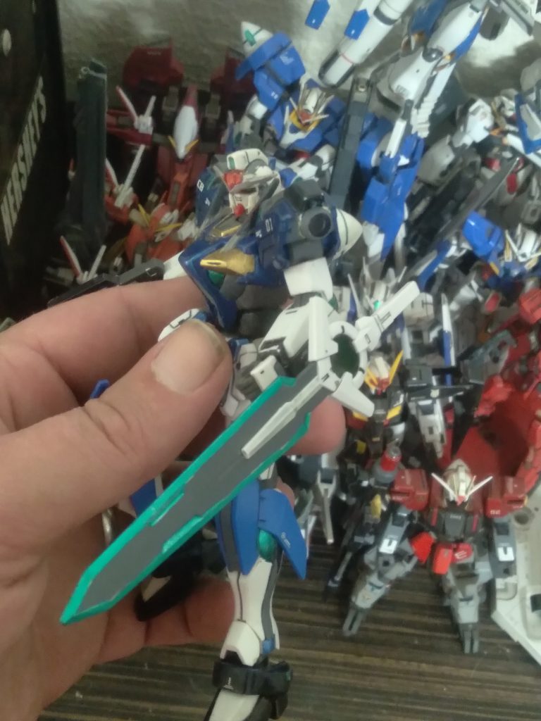 Hello Gunsta!! Today I was working on one of my customs and decided to give it an exia-type sword weapon. The sword and parts are from the 00 diver ace unit. I drilled a hole in the back of the sword for mounting. I may add some sort of shield on it as well.