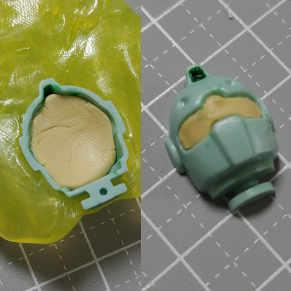 (写真1枚目)おゆまるの型を被せて、エポキシパテを詰めます。型が歪んできてるので、デコボコが出来てます。