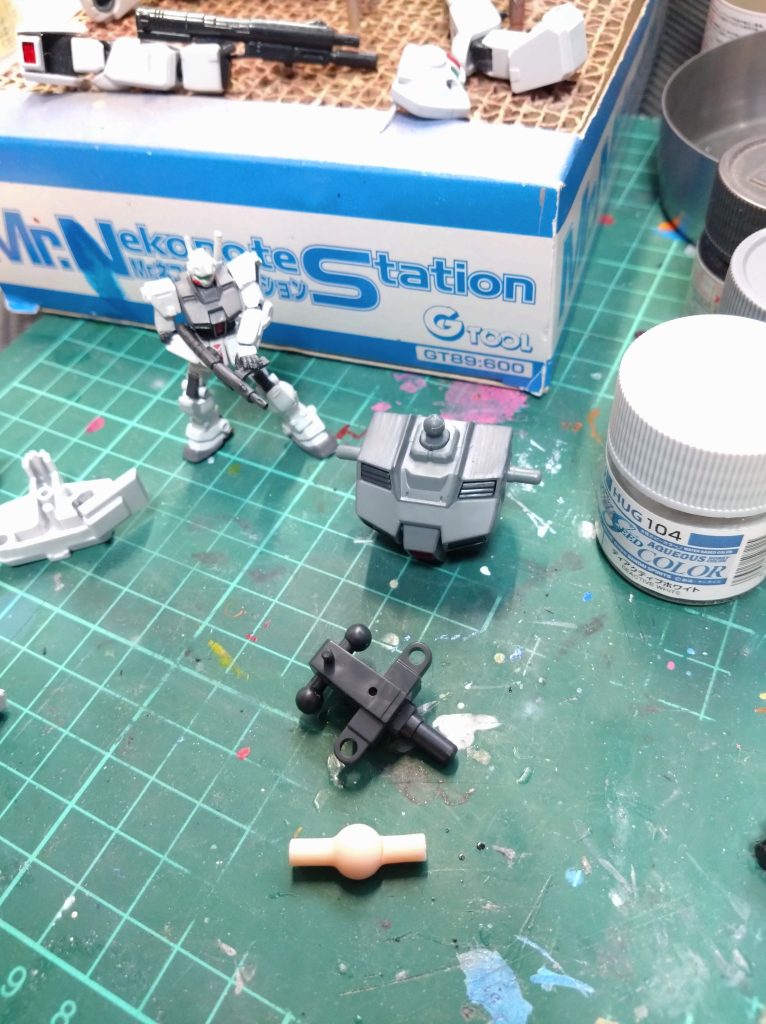 しかし急な思い付きだけに上半身の中に可動パーツを隠したいのですが可動部分の丸い部分が上半身に当たるのでリューターで少しずつ削っては位置合わせを繰り返し…。