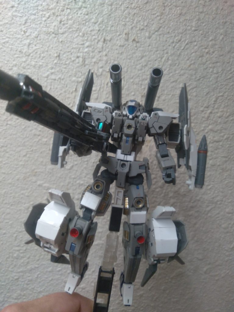 Hello Gunsta!! I have been working on my Ares custom today. I added a junk part from the schwarzritter onto the back of the Ares. By doing so, I’m able to put the nose section higher up on the back instead of down on the back skirt. This also means the cannons can be used in both modes. I also posed it with the plasma beam sword in hand.