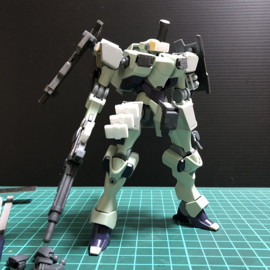 最初はAC風にしようかと思ったのですが、あまりにもベタなので特殊部隊風に作成する方針に…武装は境界戦機のウェポンセットを購入して流用、ザウォートのベクタードブースターが装備してあったピンと境界のウェポンラッチが3ミリ穴接続が無改造で取り付け可能だったので、そのまま接続してます。各部に増加装甲などを追加、以前作ったEZ-SRの余剰パーツを流用し、ランナーとザウォートの3ミリ穴で取り外しができるように作ってます。また、エコジェ風バイザーやフロントアーマー部に取り付けたマガジンなんかは、パテやらプラ板やらで適当にでっち上げてそれっぽく見える感じにしてます。