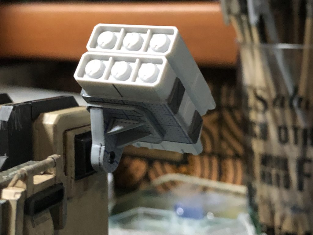 前に投稿した陸戦型ガンダムの塗装中に(コンテナにアーム接続用の工作したから他の装備に換装するのもアリだったか)なんて考えがよぎったのでミサイルポッドを検討してます。