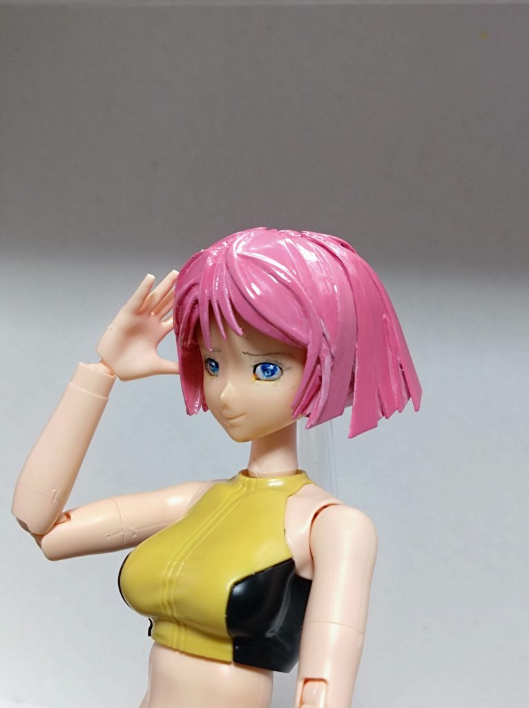 スーパーフミナ系の顔の口元は欠陥がありまして極端な形状をしているんですよね。口角を上げてにっこりした口元を再現したかったようですがちょっといびつなんです。最近私は上がっている両口角にランナーパテを盛ったりもしているんですが、ちょっとハードルが高いので、代わりに下に突き出し過ぎている上唇を少し滑らかにするのをお勧めします。