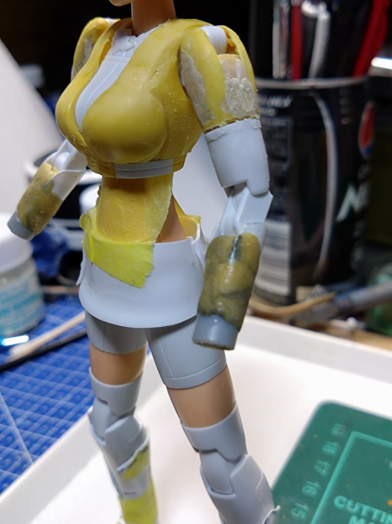 肩の加工は内側にエポパテとか詰め込んで硬化後にゴリゴリ削った方が楽ですね。めんどくさく感じるかもですが、好きな形に成形できるのでおすすめです。削り出しみたいな感じです。私はエポパテじゃなくてプラくずを詰め込んで流し込みで固めますが。
