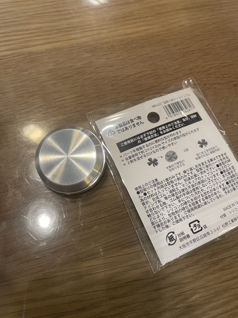 ①100均で、シリコン型を作れる粘土をゲット!!アルミの蓋の型を取り、、これまた100均でゲットしたUVレジンを流し込み固める!!