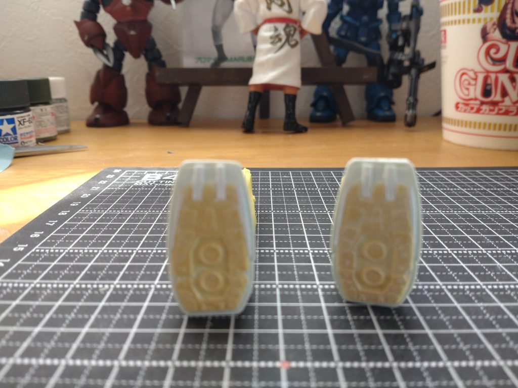 2枚目の画像のより黄色ぽい方がポリパテで、流し込みやすく、ディテールはクッキリとコピってくれました。
