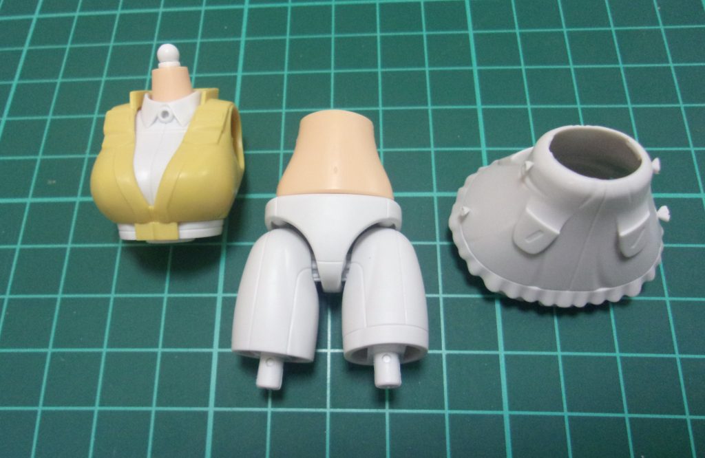 首を短縮し、それに合わせて襟も削る。胸部内のPC位置を一段奥にずらし、腹部の先端をカットし、それに合わせてエプロン上部の穴を拡げることで胴体を短縮しています。