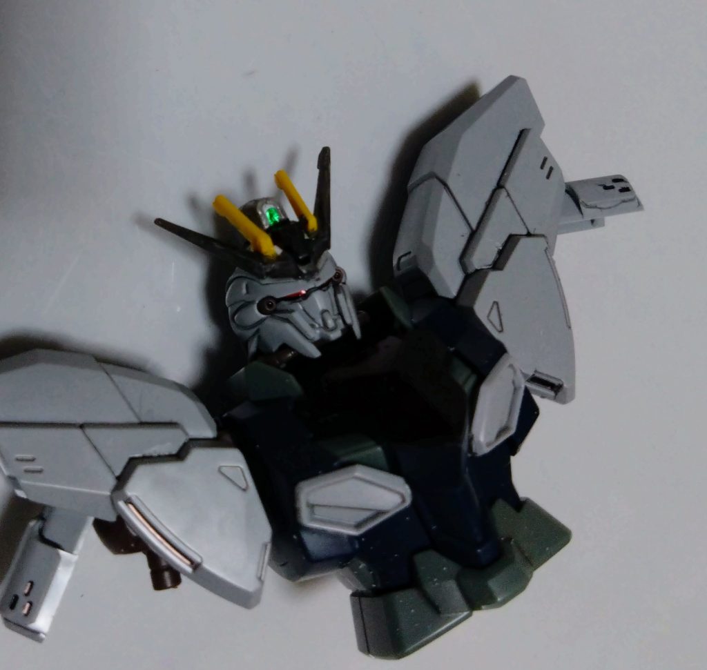 シナンジュ・スタインの頭をこんな感じにしてみました。メインカメラはHGガンダムダブルエックスから、ブレードアンテナはHGストライクから流用。メインカメラの色はガンマカを調合して塗ってみましたが、青味が少し足りないような……まあ、いいか。ブレードアンテナはグレーと黒で塗り分けてみました。