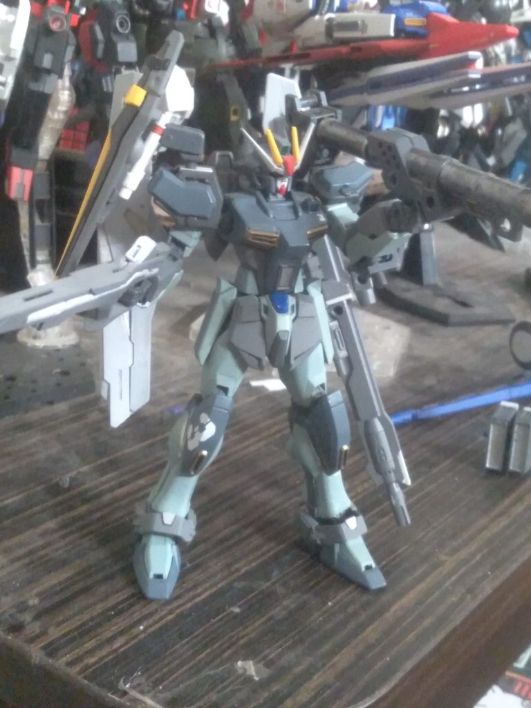 Another of the custom Strike Gundams. This one is the Spec Ops Strike. It’s made for infiltration and destruction missions. It’s coated with a special type of polymer that makes it virtually invisible on enemy radar. It doesn’t use the striker pack system. Instead, it has a backpack unit equipped with the agni cannon and an anti ship sword. It can carry a bazooka as well by mounting it on the back skirt. There are additional hard points built into the shoulders for extra equipment. The shield is moved to the shoulder for better weapons handling. It’s primary long range weapon is a new high energy charge rifle. It can fire single beams or charge to fire a more powerful beam. It is powered by the same generator that powers the suit. Since phase shift armor isn’t applied, the operating time has been greatly improved. The downside is, it’s less protected from enemy fire. It has extra thrusters on the legs to increase the speed and mobility.