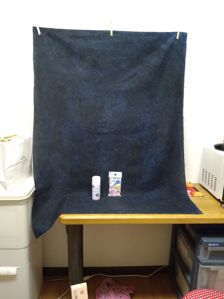 私のガンプラ撮影の場所でございます…😚以前から使っておりました手づくり〘宇宙〙の背景…🤭グレードアップ致しました!🤩 フォロワーさんの《@ComVibgyor13》さんにアドバイス頂き…🥰中々時間作る事ができなかったのですが、やっと買い物に行く事が出来…😁百均でネイルアート用の〘キラキラ〙と〘スプレーのり〙買ってきました!😆