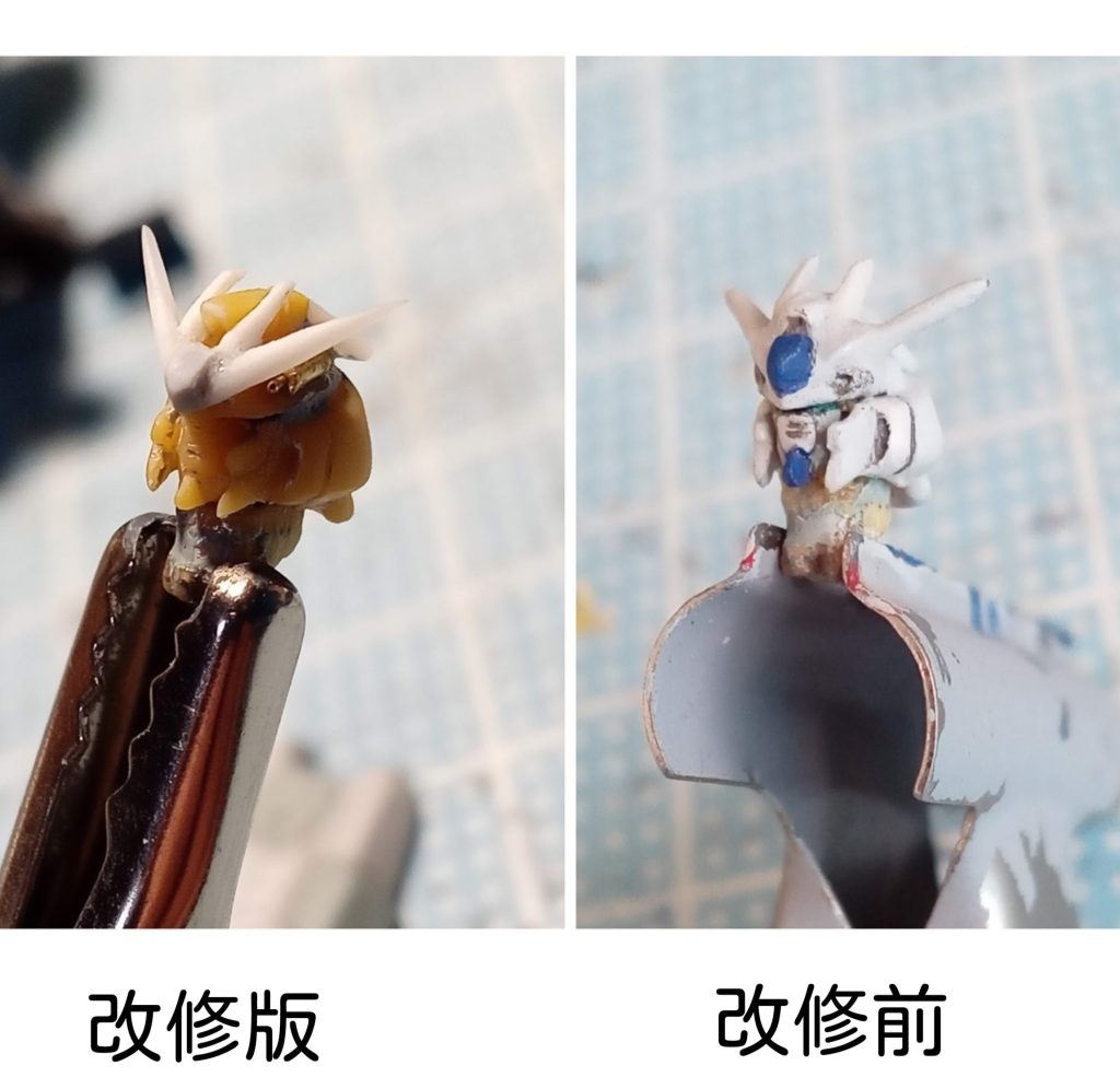 頭部。塗装はデザインナイフで落としながら改修開始。アンテナ一体型なんでそぎ落として、プラ板とプラ棒で作成。フェイス部分分解。バルカンを真鍮パイプ0.8mmと0.3㎜で作成。トサカをもうちょい良くした。
