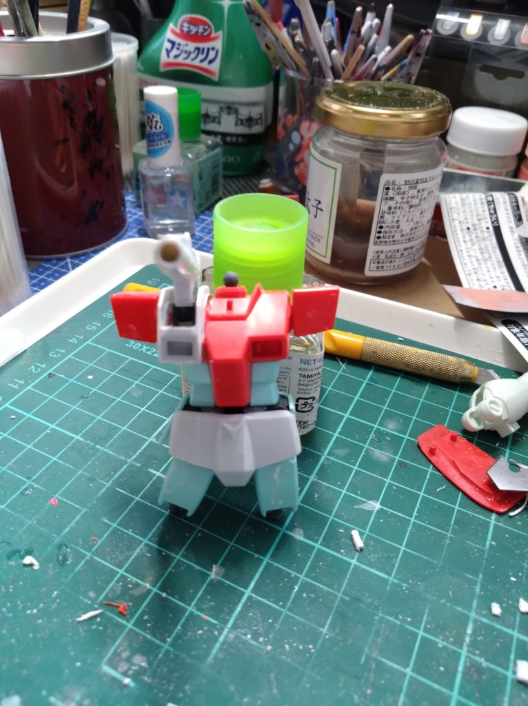 過去に制作された方々の方法見てましたが、私が見た方は腰パーツのフンドシ部分を切り取って接着してましたが綺麗に切り取る自信がなかったのでジム・キャノンの腰パーツを胴体から切り出しサイドを切断してそのまま接着しました。