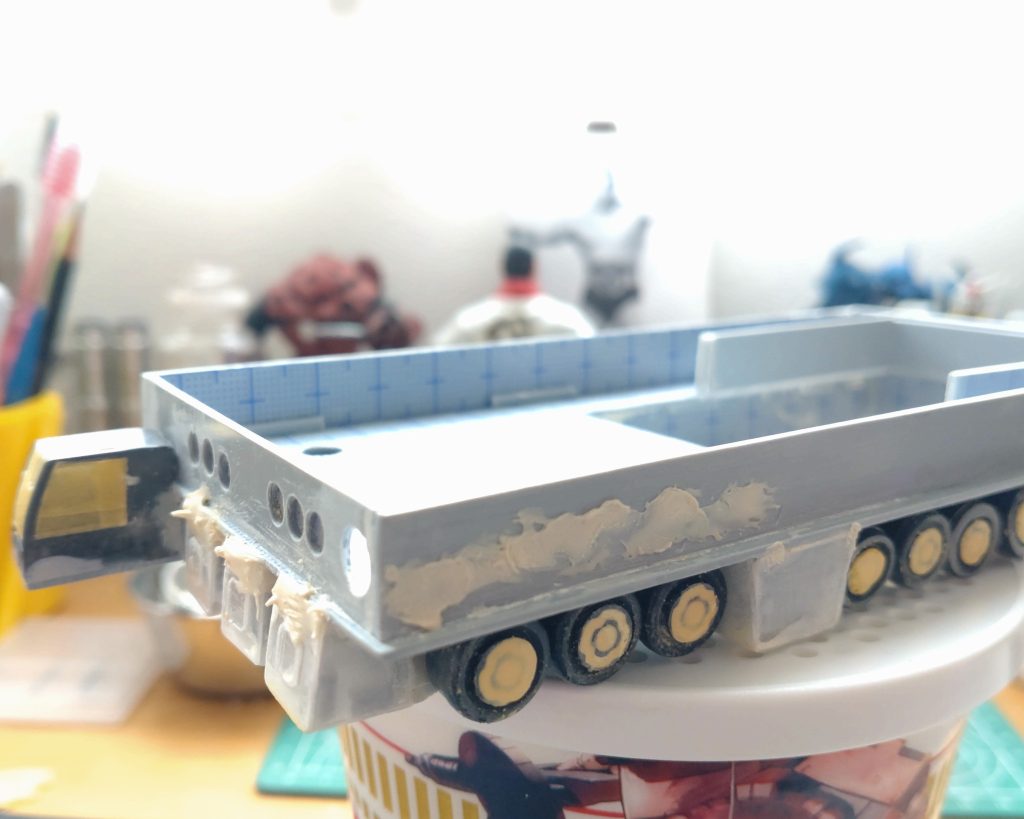 何となく形が出来てきたガンダムトレーラーを、メーカーさんの技術力が無いため、酷い合わせ目を埋めつつ、タイヤを両面テープで留めてみて、何となく行けそうな事を確認。