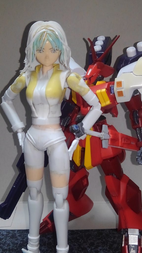 ノーマルスーツだと肌が出せないので色気が無いかなと、普段着にしました。MSと一緒なんだからノーマルスーツも良かったですね。ただググった時、一番目に付いたフィギュア姿がこの服装だったのであまり考えず選択したというのもありますw やっぱり見本に出来る立体物があると作りやすいのですよね。