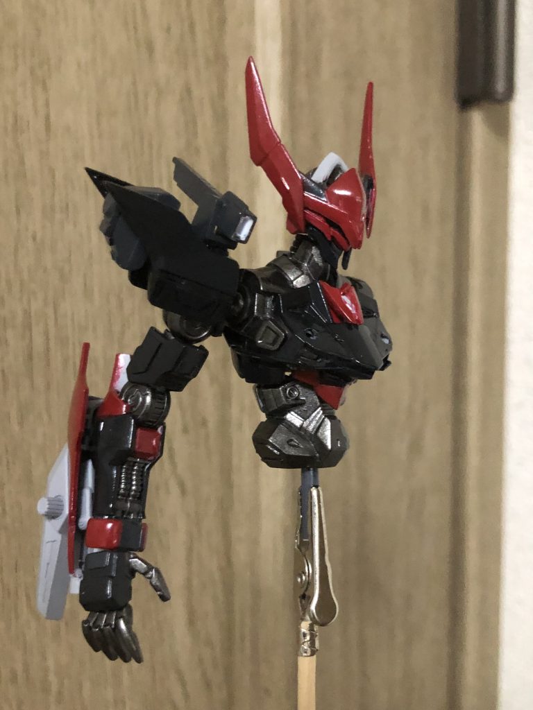 進捗報告でございます。メタリック塗装に着手し始めました。焼鉄色、黒鉄色、シルバーの3色でどれ使うかとなって、最初は焼鉄とシルバーを混ぜてやってましたが「なんかちげえな」となって黒鉄とシルバー混ぜたところ無茶苦茶自分好みになりました。黒鉄ほど暗くもなくガンメタよりも暗いちょうどいい重厚感ある感じになって満足ぅ()。他の関節とかもこんな感じで塗っていき、あとは所々にメタリックレッドを塗っていって、まだ塗れてないところを塗って最終確認したらトップコート吹いて完成といったところ。いよいよ完成が見えてきましたよ…。あと今回は試みとしてガイアノーツのエナメル蛍光クリアなるものを見つけたら使ってみたいなと思います。見つけられるといいなぁ。
