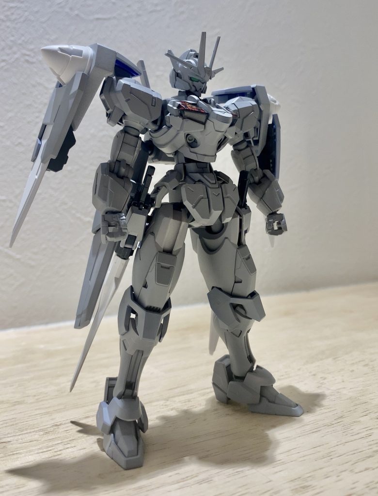 ありそうなやつですが、ダブルオーガンダムとエアリアル改修型をミキシングしました。膝のプロテクターみたいなのものと腰のパーツはダンタリオンのパーツを流用しています。