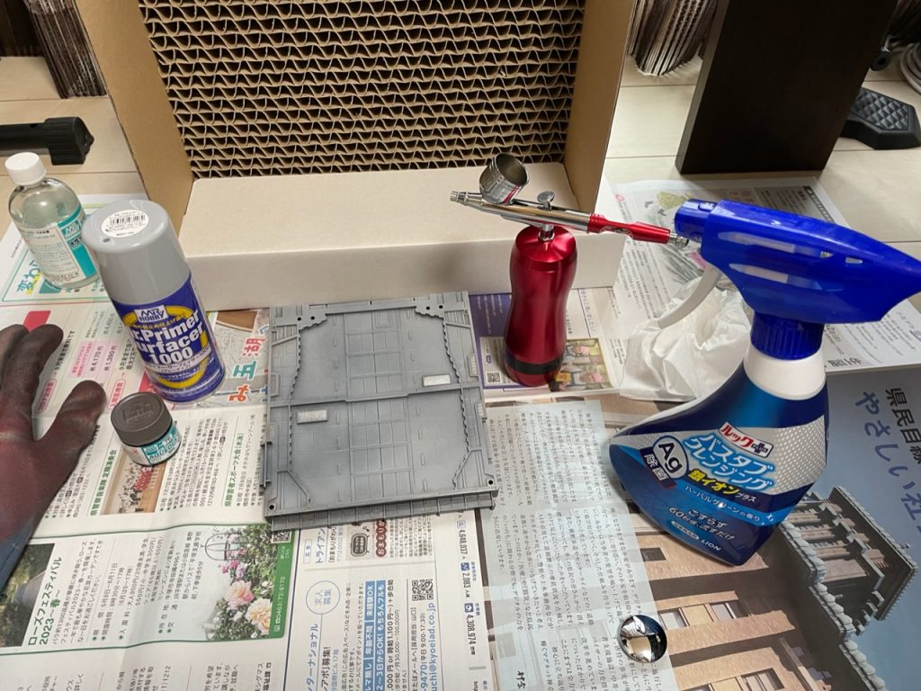 缶スプレーのサフを吹いた後、購入した充電式エアブラシ(人生初!!)で水性ホビーの焼鉄色を吹いてみたけど、塗りたい場所を上手く狙えずマジックリンで除去。