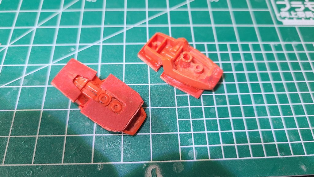 足底のバーニアと凸形状、ふくらはぎ側面と後部スラスター。。。やりたくないけど我慢して製作してます。