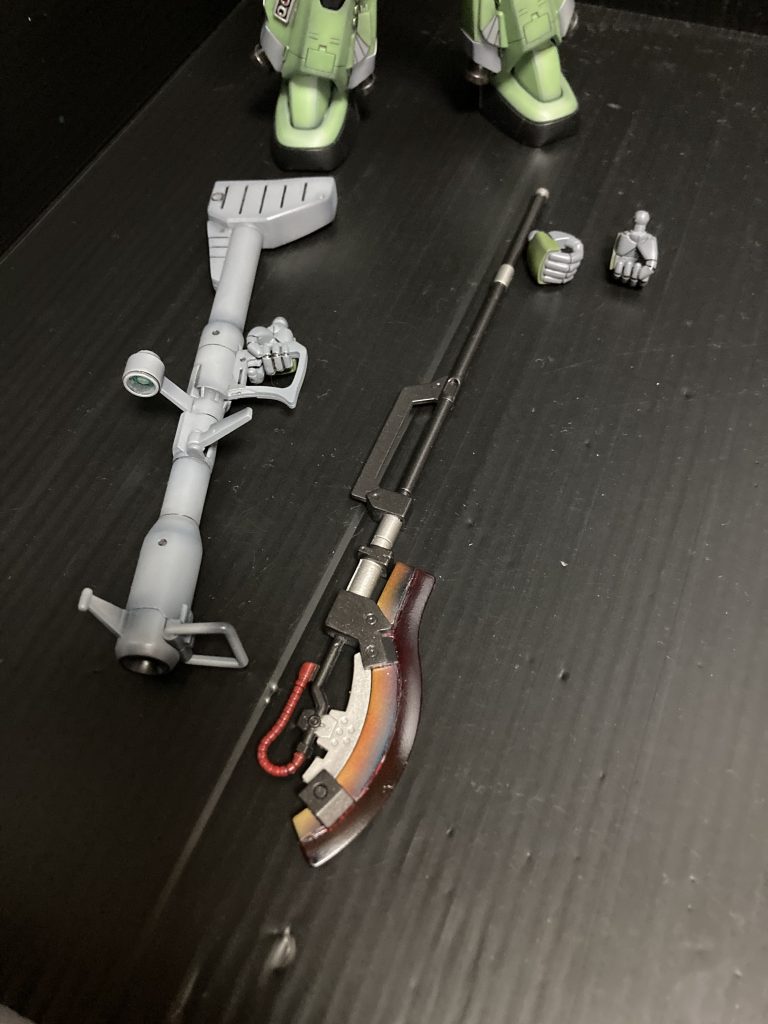 斧の刃はクリアレッドやブラックですかね。私はクリアパーツが苦手で塗装に困ります。