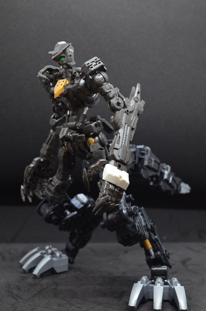 なおオリジナルと区別するため、ハンドパーツはコトブキヤさんのヘキサギアから、「ガバナーヘヴィアーマータイプ:ルーク」を2セット使用し、全指可動化を行っています。その際、1/100ルプスレクスからネイルパーツ部分を切り取り、貼り付け加工しています。