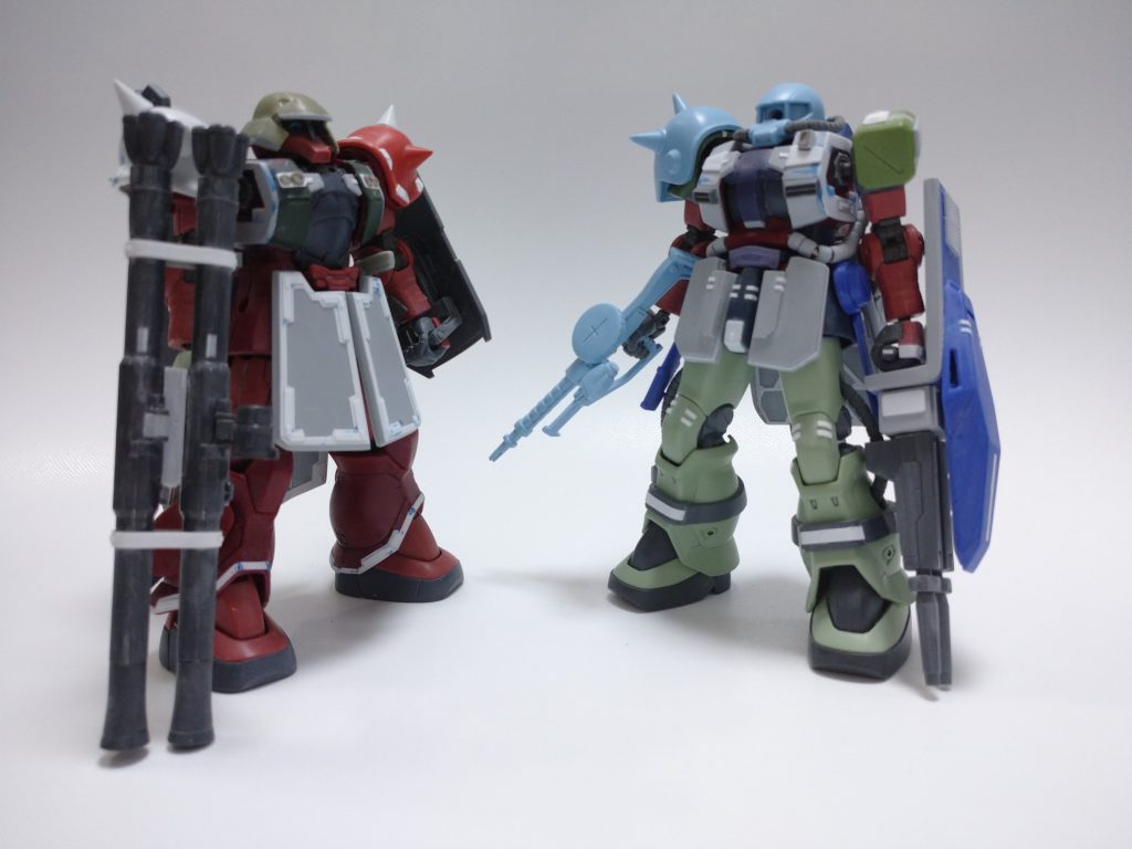 両者とも結構尖った仕様のザクですね。サフ吹くとしっくりくるのでしょうか。