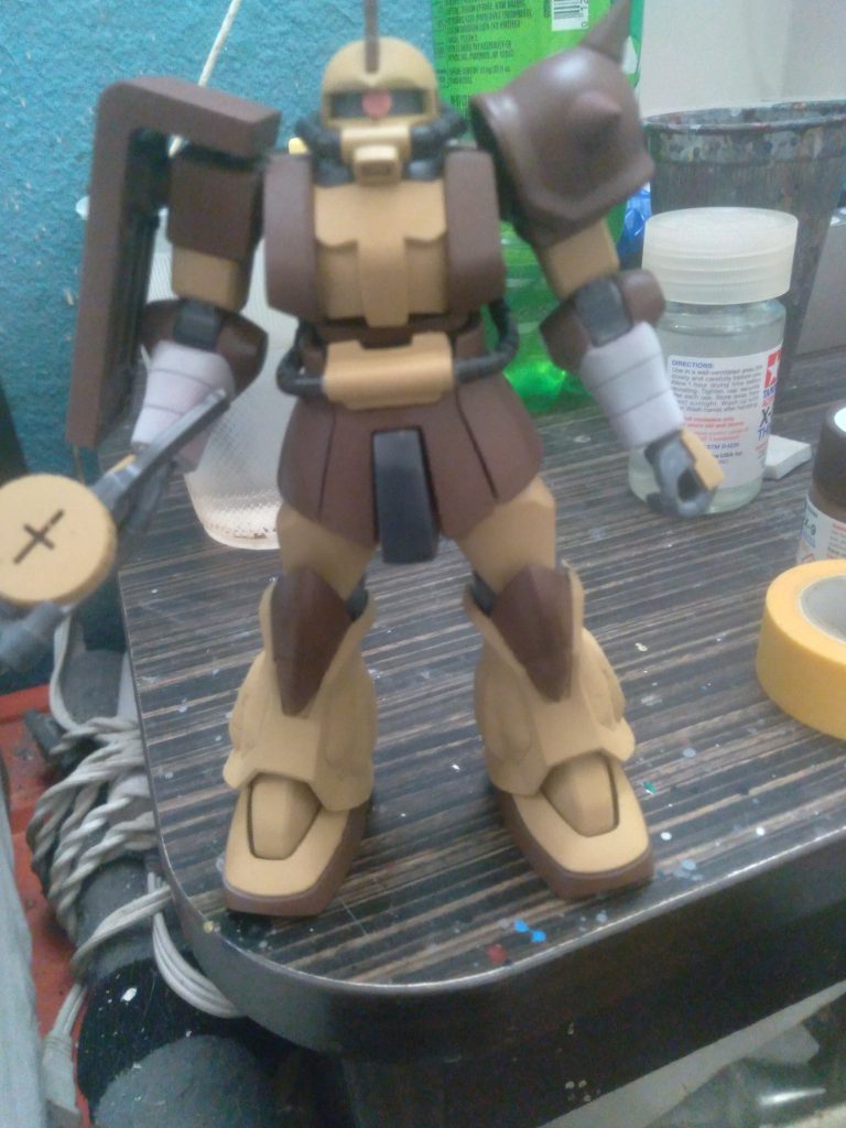 My custom kitbash of the black tri stars zaku and gouf custom. Painted in desert colors. I’ve got a few minor things to finish up