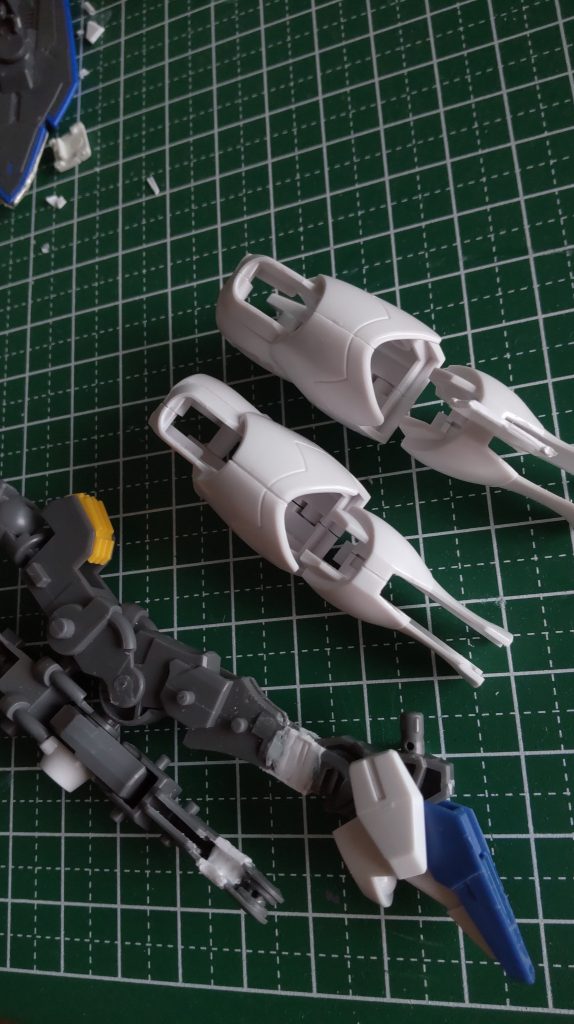 段落ちモールドに初挑戦しました。間にプラ版入れてタガネで掘る方式でやりましたが、幅が狭いせいか合わせ目とあまり変わらないかも。プロポーションあんま気にしなくていい機体かなと思ってましたが、一応すねの延長も4mm分挑戦してみました。足回りを肉付けすると足が短めに見える気がするので、これは効果を感じられてやってよかったです。足は自立できるようにしたくてヒール状のかかとも一回仮付けしましたが、伸びたつま先からすね裏のラインに邪魔が入る感じがしたので外しました。