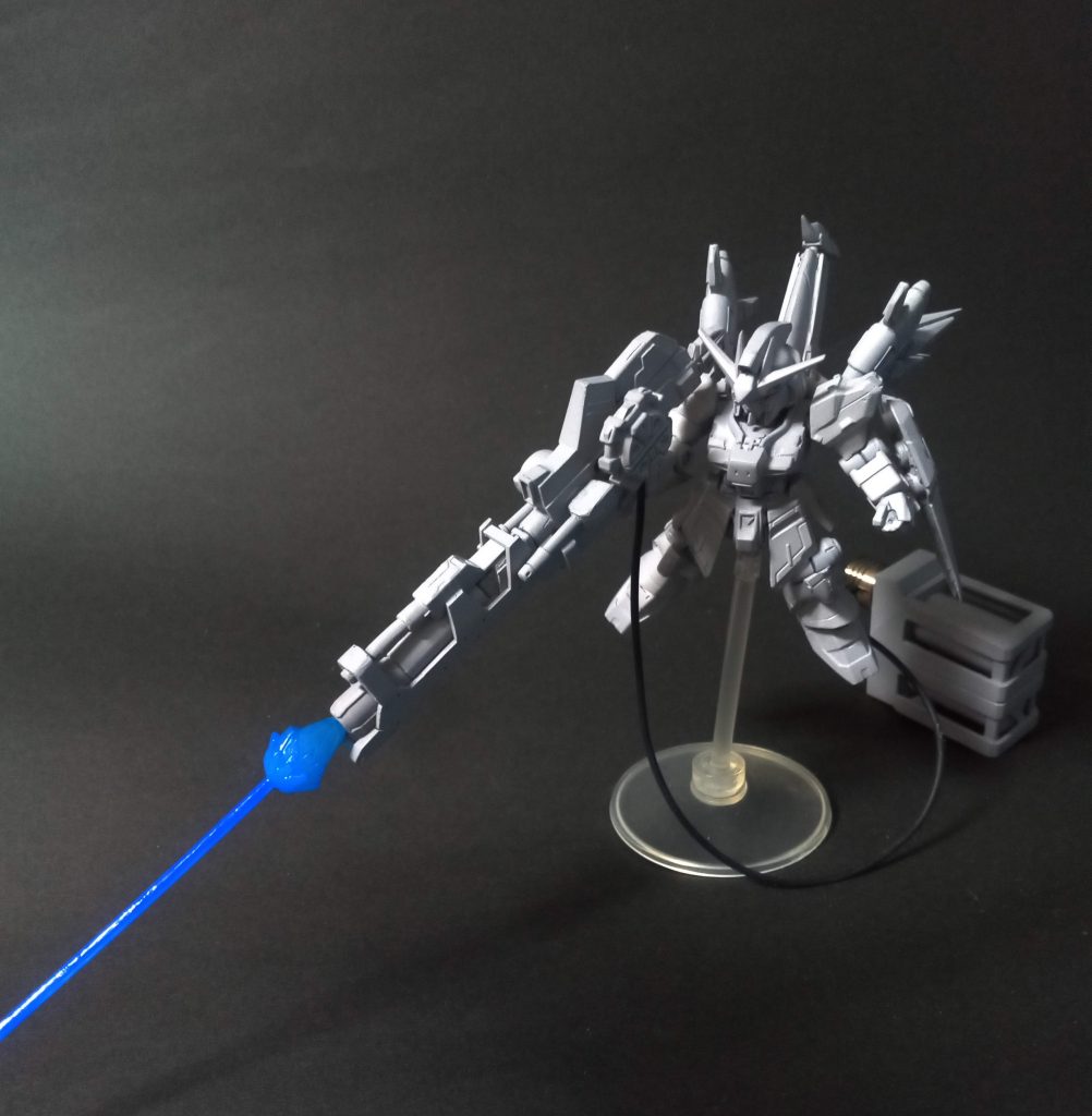 放出エフェクトは、BB戦士のνガンダムのファンネルエフェクトの半面を2つUVレジンで複製して、あわせて(片面肉抜きされてて埋めるのめんどいので)放出の根元エフェクトにし、透明ソフトプラ材で弾道にして、蛍光エナメルで塗装。