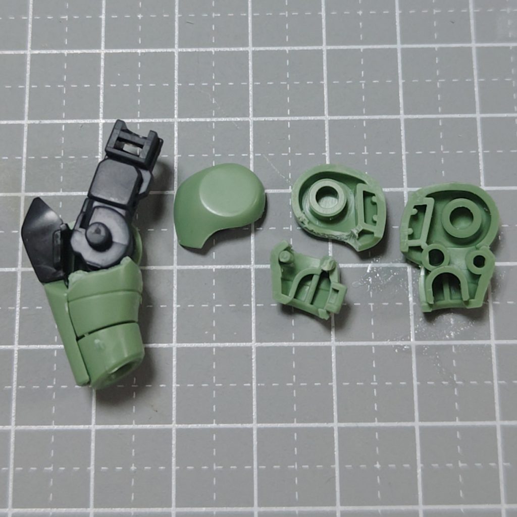 (写真1枚目)肘関節の後ハメ工作です。肘のお椀状の箇所の片側(ダボのオス側)をエナメル割りで切り離しました。最後に蓋をするような感じです。