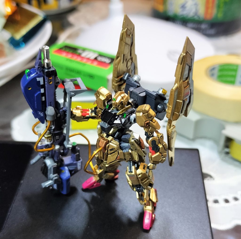 そういうワタシは家族が寝静まってからダイニングの椅子を玄関に持っていって暗くして、そのいすにくろのフェルトシートをかけた上にガンプラ置いて、百均の自転車用ledライトだけスポットライトみたく当てて陰影を強調して2秒セルフタイマーで撮ってます。アーティファクトのハイディティールが引き立ちアラが隠せて一石三鳥(笑)