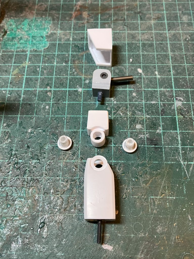 肘関節も旧キット特有のハメ殺し、簡単に後ハメ加工するならC字に切り込みはめますが、それだと曲げる角度によって見えると思うので、違うやり方としてピンハメにしました