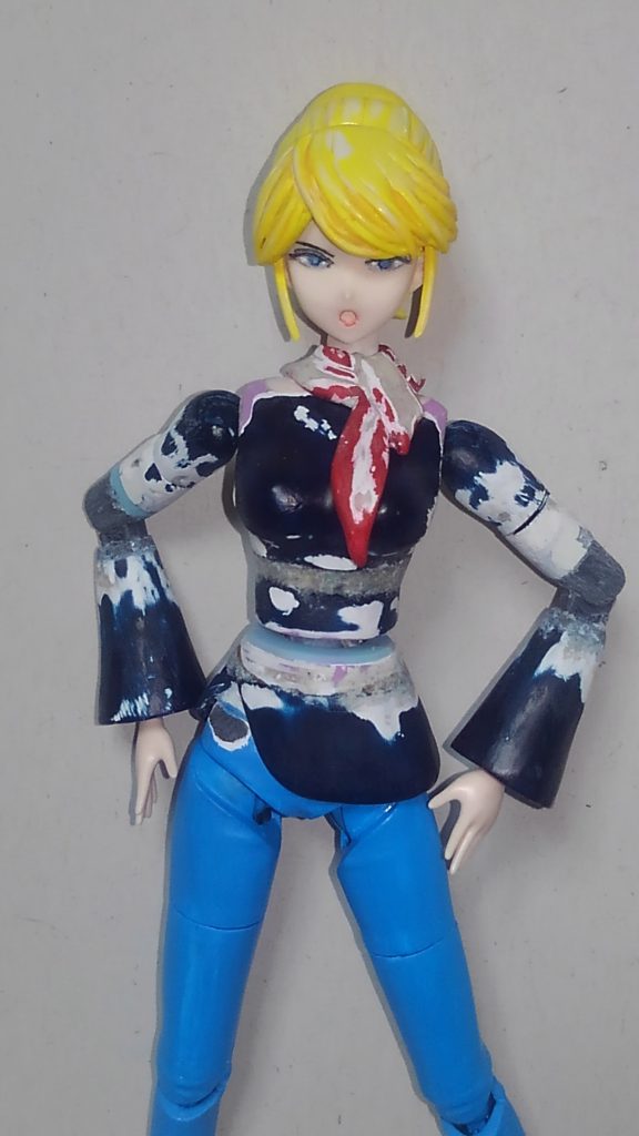 ボディーを改修してます。胸と下腹部にジョイントがあったのですが、キャラ・スーンと同じような腰の可動一点に変更。こっちの方が自然な姿勢が取れるんですよね。隙間はベルトで隠します。上半身が微妙にマッシブだったので削りこんでます。肘の関節を変更。脚は細すぎる気もしますが、現状維持ですかね。もしかしたら、もうちょっと丸みを付けるかもしれません。
