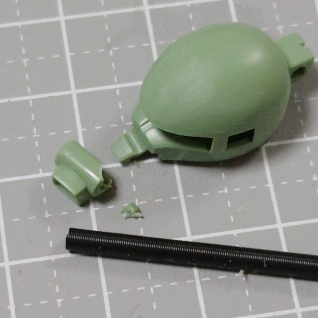 それで修正する際、この口のパーツをつまんでヤスリがけすると、指先が痛すぎたので、本体に接着して作業しました。最初からがっちり接着しておけば、穴を開けても欠けるリスクを減らせたんですよね。別に塗り分けも無い箇所ですし。